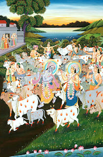 Once while herding the cows, Krishna-Balaram and the Gopas came over to a large reservoir water in Khadiravan. They had their cows drink water first and then as they were quenching their thirst with the cool refreshing waters, they saw something very astonishing. It seemed that a huge mountain in front of them was shaking and moving. The huge creature was actually the duck demon, Bakasura sent by Kamsa. Before anyone could understand what was happening, the wicked demon leaped upon them and swallowed Krishna with his sword like huge pointed beak. Balaramji and the Gopas in anguish fell to the ground unconscious, practically breathless, out of their intense affection for Krishna.