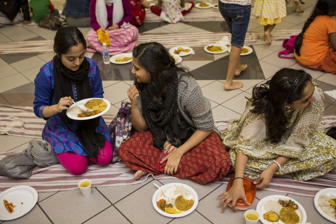 Dinner is served cafeteria-style, and volunteers greet us with a friendly “Hare Krishna” before spooning food onto our plastic plates. Inside a great hall, we find a spot on the floor where white-and-purple-striped running cloths are laid out in place of tables. Adults catch up over dinner, while youngsters run through the hall and teenagers sit poring over homework.