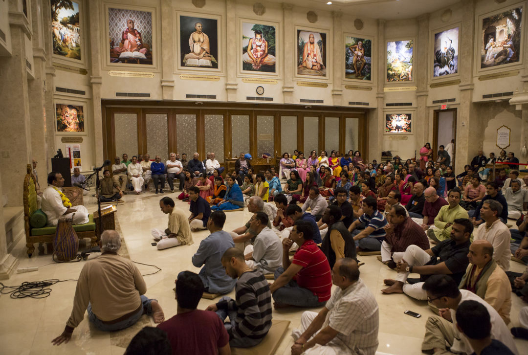 After dinner, Kripa and his wife lead us across a manicured lawn into the heart of the 24,000-square-foot temple. “We have to go pick up my uncle from the airport, but please come to our son’s wedding this Saturday,” says Kripa’s wife, who has also invited several other people during our brief walk. Once inside the dazzling structure, its ivory ceiling carved into a massive, three-dimensional lotus flower and its walls decorated with paintings of azure-hued Krishna, we watch the night’s worship service come to a rousing close.