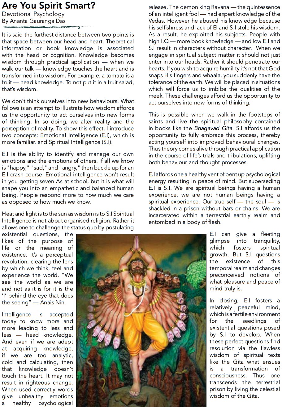 The demon king Ravana - the quintessence of an intelligent fool had expert knowledge of the Vedas. However, he abused his knowledge because his selfishness and lack of EI and S.I stole his wisdom. As a result, he exploited his subjects. People with high I.Q more book knowledge and low E.I and S.I result in characters without character. When we engage in spiritual subject matter it should not just enter into our heads. Rather it should penetrate our hearts. If you wish to acquire humility it’s not that God snaps His fingers and you suddenly have the tolerance of the earth. We will be placed in situations which will force us to imbibe the qualities of the meek. These challenges afford us the opportunity to act ourselves into new forms of thinking.