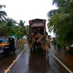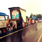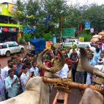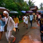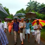 When we reached the village, to our surprise 500 people were waiting to welcome us, despite the rain. It goes to show that nothing can stop the Lord’s devotees. Everyone stood with umbrellas and the local residents played auspicious music and instruments. After walking with us for some time they released the bulls from the pāda-yātrā cart and began pulling the cart themselves. Sri Sri Nitai Gaurasundar must have been very pleased with their seva. What a grand procession it was! Later everyone also joined us for saṅkīrtana.