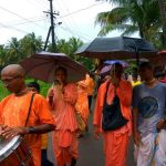 On August 28th we travelled to the village of Nileshwaram, also known as Nileshwar or Neeleswaram in the Kasaragod district of Kerala. Caitanya Rasamrita Dasa, president of ISKCON Kannur grew up in this village. Actually both he and his family first came into contact with devotees while living in a foreign country. Now, his whole family along with his brothers are devotees. When he received the news that our pāda-yātrā was visiting his village he made arrangements how to welcome us, and for our accommodation with the devotees there.