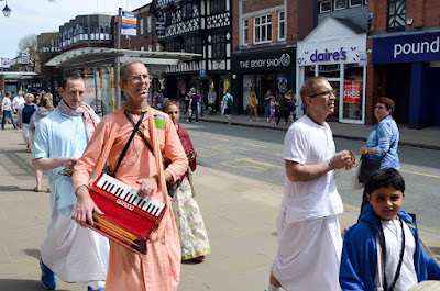 Although the harinama in Chester was only an hour, it was lively with ten devotees. Dave from Manchester played his guitar, which added another dimension. Some kids had the greatest fun dancing with us, and their parents seemed to quite happy about it.