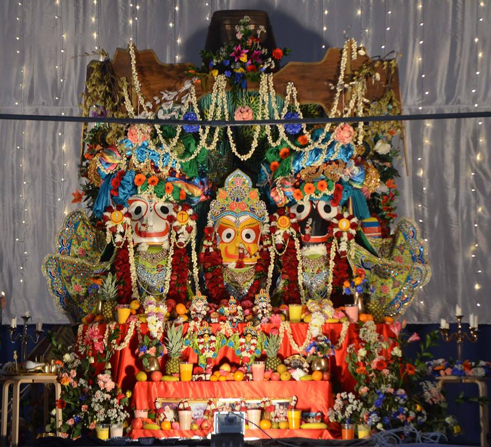 Lord Jagannatha, Lord Baladeva, and Lady Subhadra are always the focus of attention at the Birmingham 24-Hour Kirtan venue.