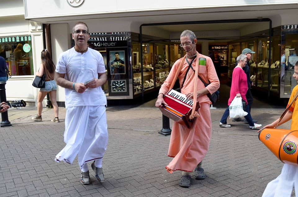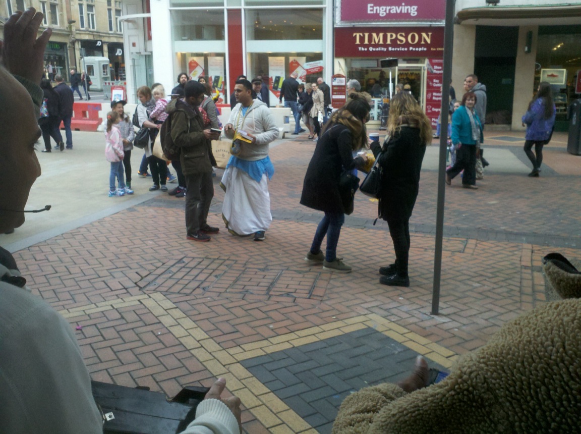 I was happy that Bhakti Rasa Prabhu, Kirtida Devi, and Prema Sankirtana Prabhu joined me on harinama my first day back after traveling to Belgium, Holland, and Birmingham. Bhakti Rasa Prabhu, a native of Newcastle, has been doing harinama for years, and many people in Newcastle know of Krishna and the Hare Krishna mantra. Here he chants with enthusiasm (https://youtu.be/HeT0J_pPuKM):