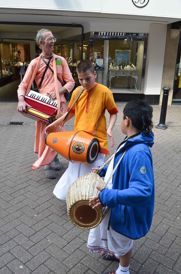 Although the harinama in Chester was only an hour, it was lively with ten devotees. Dave from Manchester played his guitar, which added another dimension. Some kids had the greatest fun dancing with us, and their parents seemed to quite happy about it.
